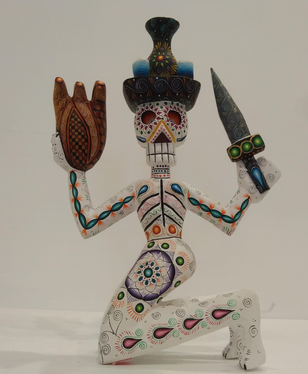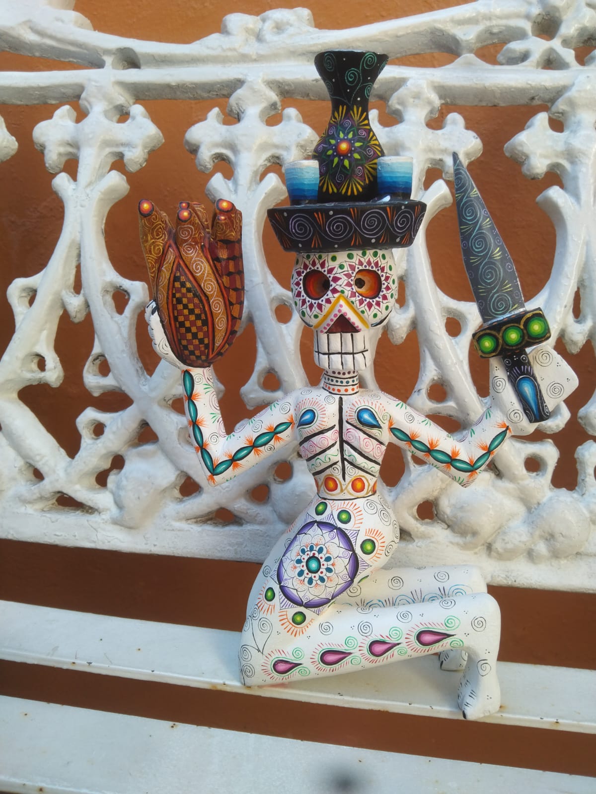 Este impresionante Catrín artesanal ha sido tallado y pintado completamente a mano, mostrando un nivel de detalle único y colores vibrantes que lo hacen una pieza especial.